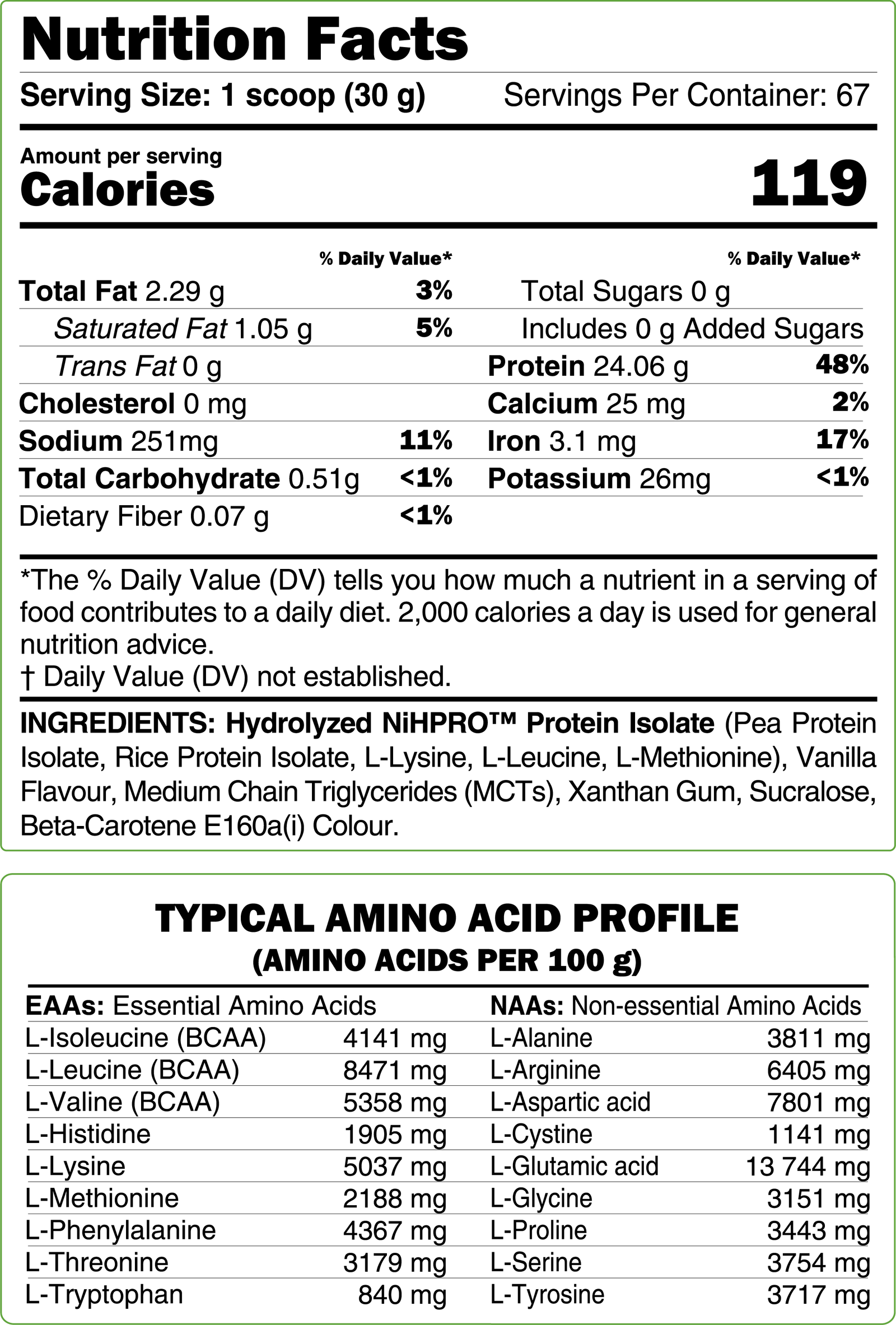 Gehydrolyseerd NiHPRO®-eiwitisolaat (erwteneiwitisolaat, rijsteiwitisolaat, L-lysine, L-leucine, L-methionine), vanillearoma, middellangeketen-triglyceriden (MTC's), xanthaangom, sucralose