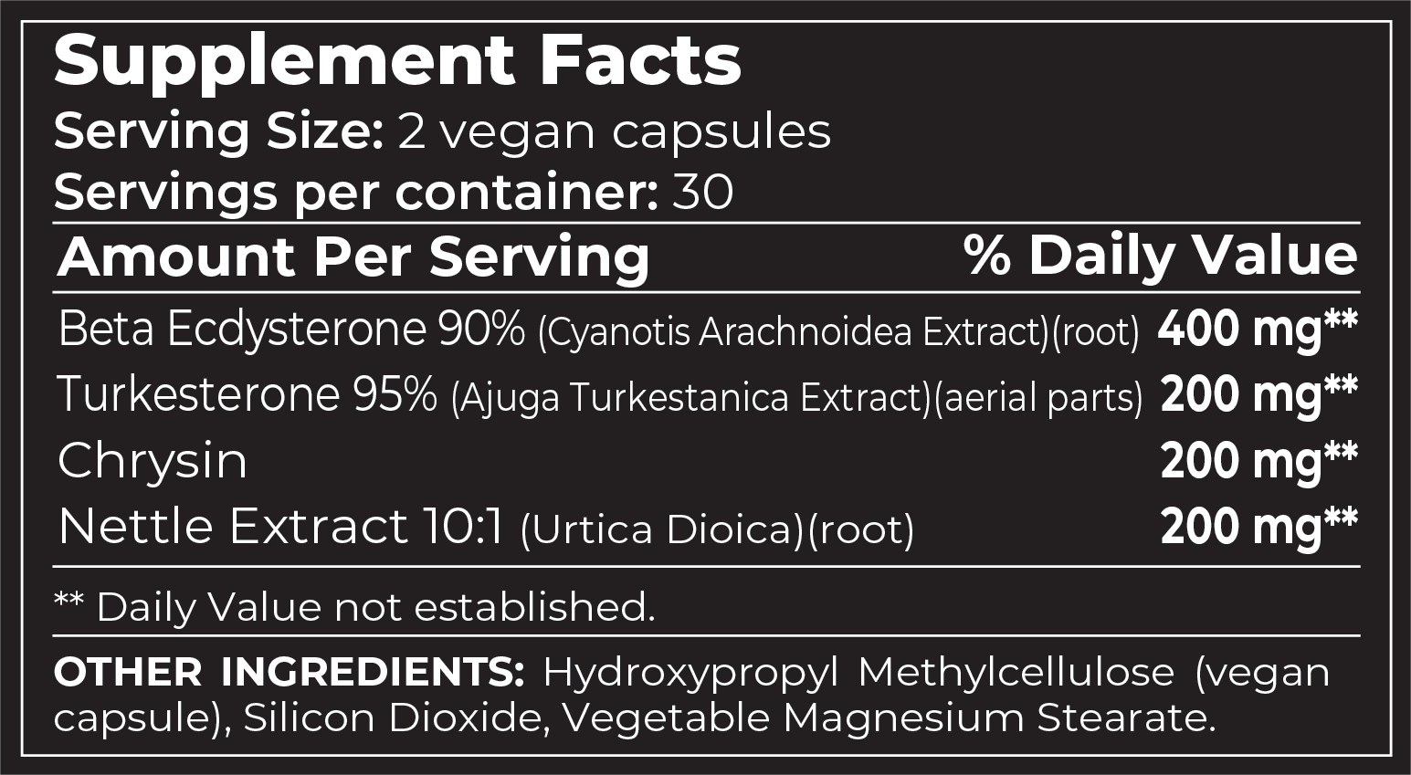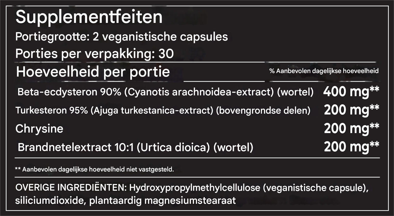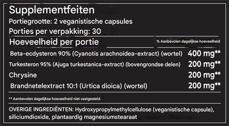 Beta Ecdysterone 90% (Cyanotis Arachnoidea Extract)(wortel), Turkesterone 95% (Ajuga Turkestanica Extract)(bovengrondse delen), Chrysin, Brandnetelextract 10:1 (Urtica Dioica)(wortel)